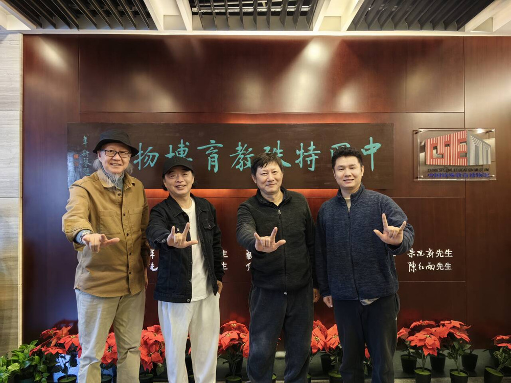 上海聋人艺术家葛斌、郑小三、何立峰与马建强馆长在序厅合影留念